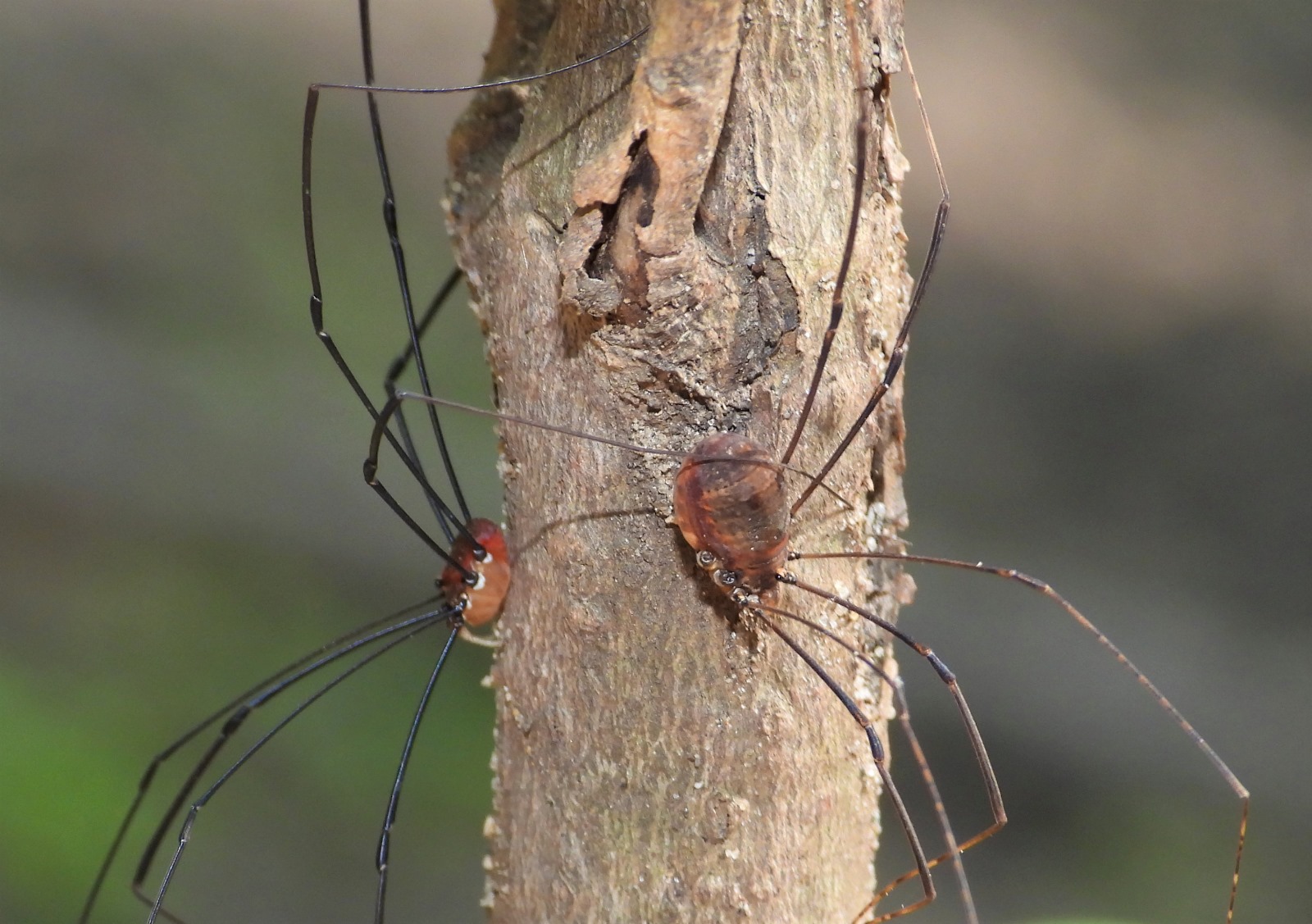 Fácilmente diferenciable por su pequeño cuerpo y muy largas y finas patas. Se diferencian de las verdaderas arañas (Orden Araneae) por la ausencia de estrechamiento (cintura o pedicelo),
